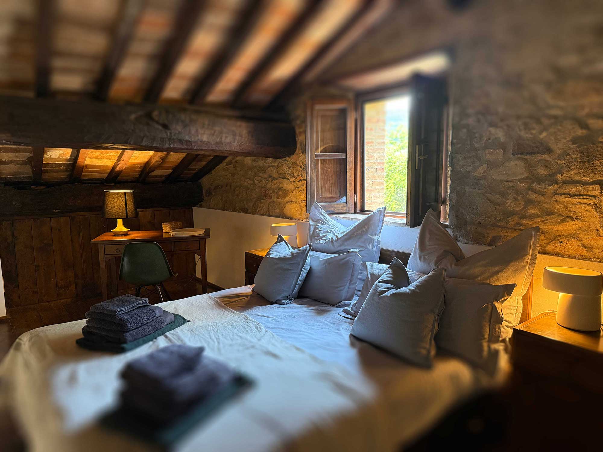 Five holiday apartments in typical Tuscan country house style, combined with timeless design and classic furniture – featuring stone, wood, and plenty of light. Individually designed, high-quality, and extensively furnished, ideal for two to eight people. Our kitchens are equipped with solid wood fronts and granite countertops, and all apartments feature